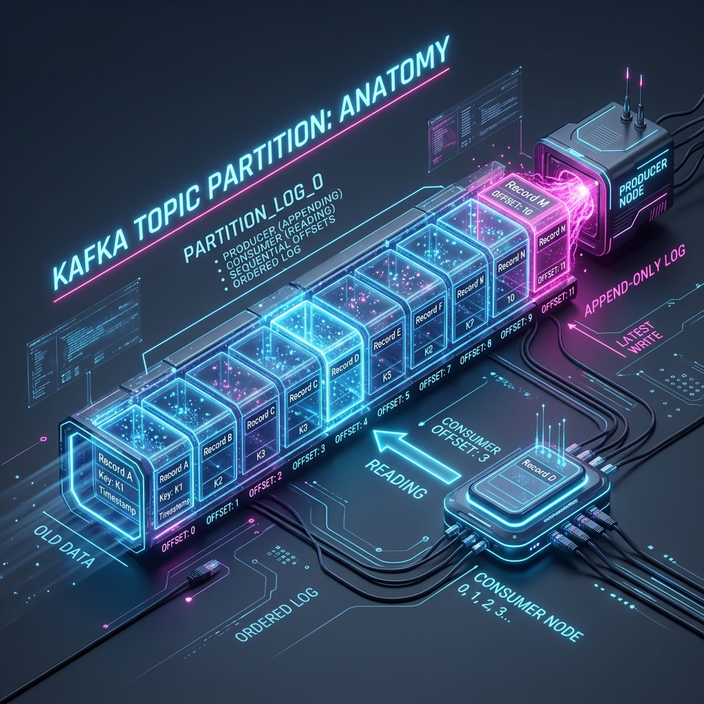 user_clicks,payment_transactions). - Partition: To scale horizontally, a Topic is divided into Partitions. Each Partition is an append-only, ordered log stored on disk.