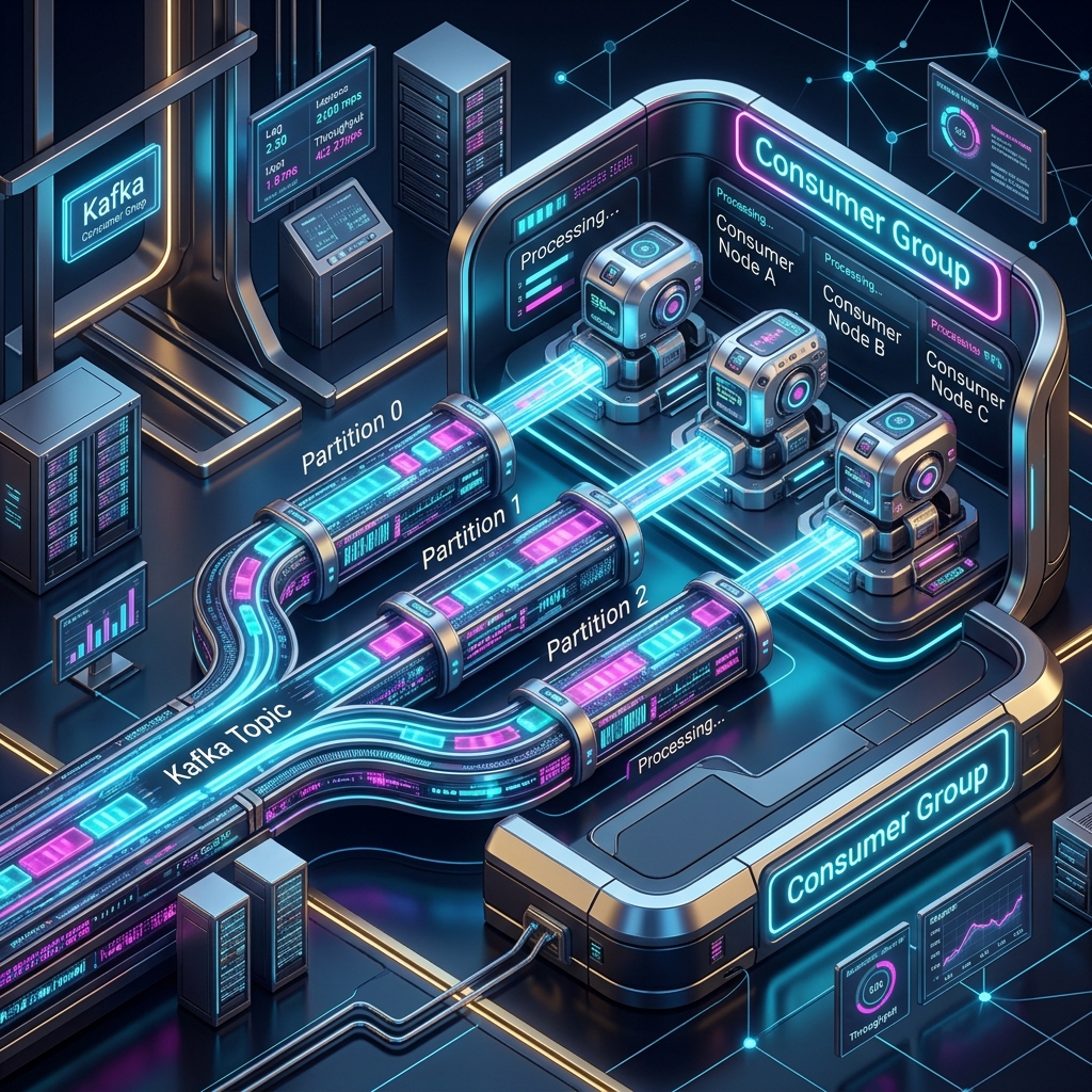 If your Topic has 3 partitions, and you start a Consumer Group with 3 consumers, Kafka automatically assigns one partition to each consumer. They process data perfectly in parallel. If a consumer crashes, Kafka automatically reassigns its partition to a surviving consumer (a process called Rebalancing). This is the secret sauce to Kafka's massive scalability.