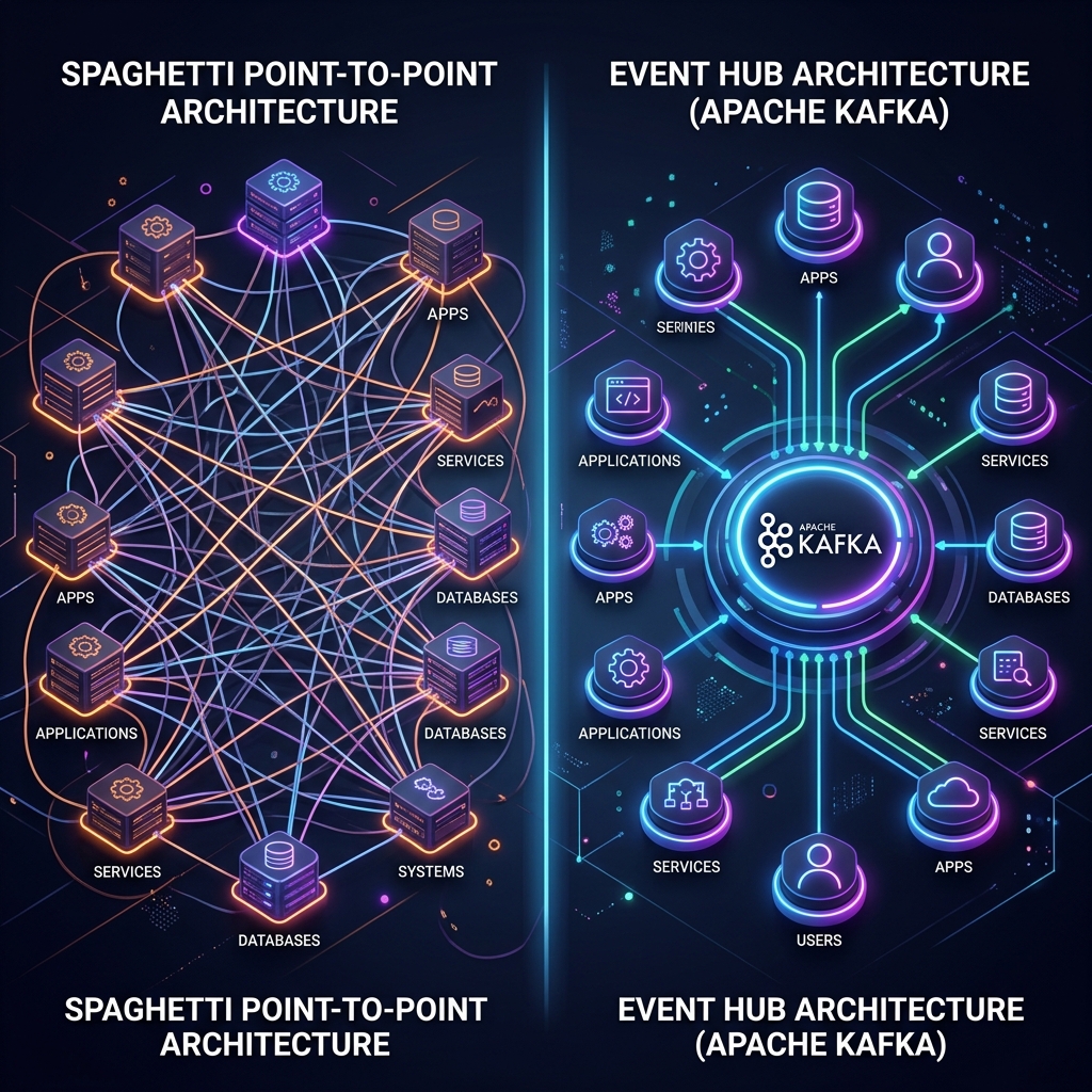 Kafka replaces the chaotic N x M point-to-point connections with a clean, centralized event streaming hub.