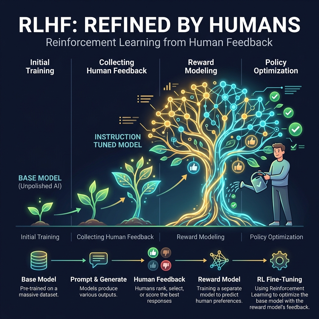 To turn that raw "pattern-matcher" into a helpful assistant, we use Reinforcement Learning from Human Feedback (RLHF).