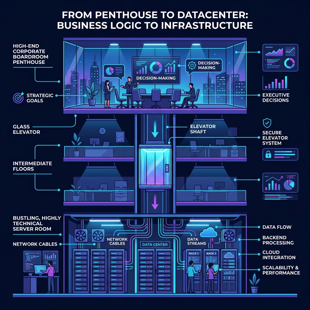 The Concept: The architect is the person riding the elevator. They must be able to speak the language of business ("ROI," "Time to Market") in the penthouse, and then ride the elevator down to the engine room and translate that into technical reality ("Latency," "Database Sharding," "Microservices"). If the elevator is broken, the strategy never becomes reality.