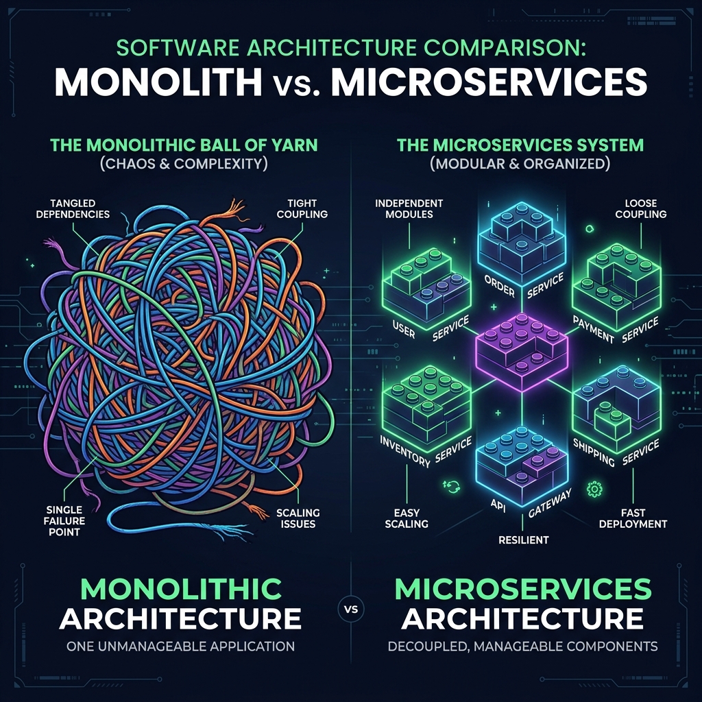 The Concept: Microservices are like playing with Lego blocks. You break the giant ball of yarn into small, independent pieces. If you want to replace a red 2x4 Lego brick with a blue one, you can do it without destroying the whole castle. However, managing 1,000 separate Lego blocks comes with its own massive operational headache (the "Distributed Monolith" trap).